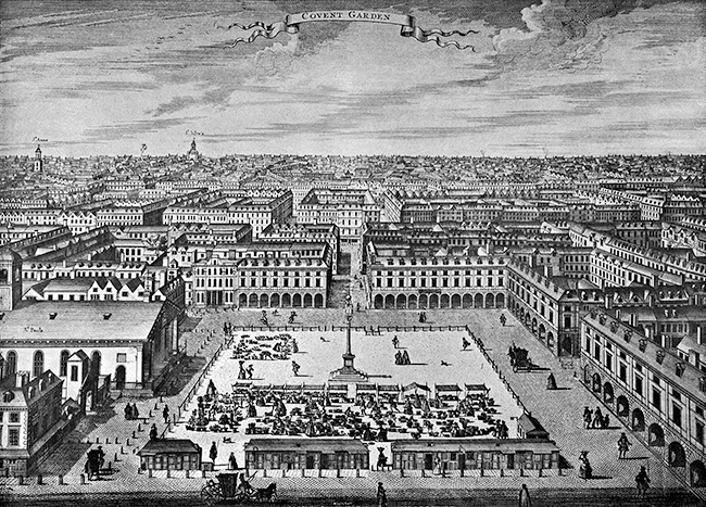 Covent Garden looking north, c. 1720, from an engraving by Sutton Nicholls. Public domain, via Wikimedia Commons
