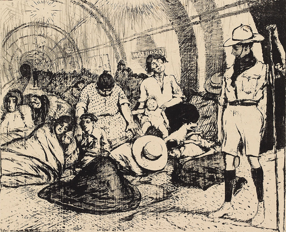 Henry Moore's studies of civilians sleeping in the London Underground during the Second World War are relatively well-known (for example, Shelterers in the Tube in the Tate), but the Tube was also used as a place of shelter from air raids during the First World War. Archibald Standish Hartrick (1864–1950) sketches a variety of types forced to sit cheek by jowl in the confined space of the Holborn Underground station in this informal and sympathetic lithograph. The standing boy scout to the right provides a lively contrast with the exhausted-looking women surrounded by their sleeping children in the foreground. During the war women were recruited to work in traditionally male jobs on the Underground transport network, as substitute guards, clerks and painters, because of the shortage of manpower. When the new Maida Vale station opened in June 1915, it was staffed entirely by women.