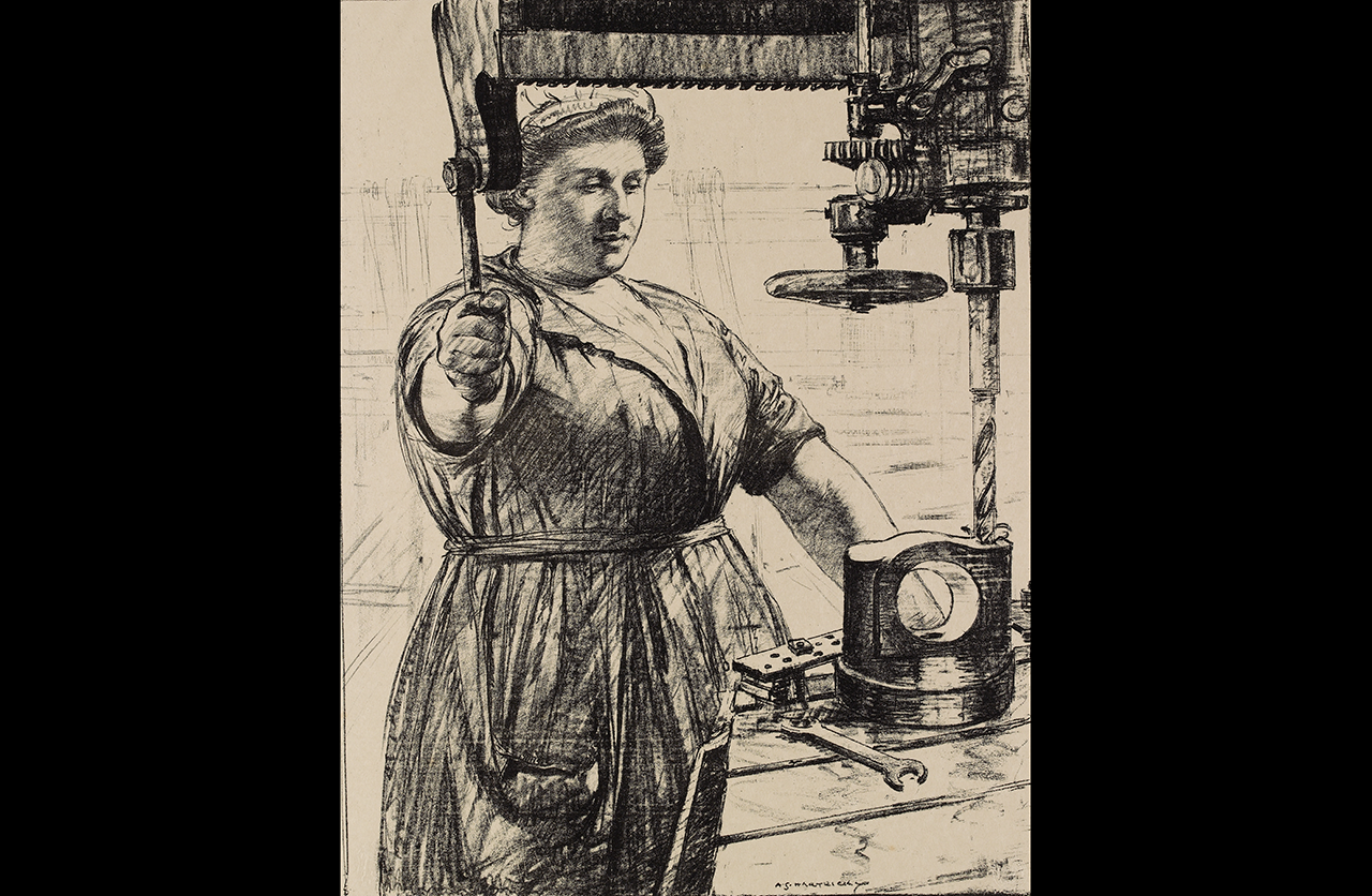 Hartrick's series of six lithographs for the Efforts and Ideals series, 'Women's Work', reveals the important roles played by working women during the war, from bus conductors, carriage cleaners and farmhands to workers in heavy industry and the dangerous packing of munitions. The unidealized presentation of this portrait underlines the seriousness with which women approached their new opportunities for employment; the woman is as solid and powerful as the machine she controls. Born in Bangalore, the son of a British Army officer, Hartrick studied art at the Slade School and in Paris, becoming friends with Van Gogh and Toulouse-Lautrec. He is best known as a lithographer, and in 1940 – in an echo of his lithographs for the Efforts and Ideals – he was commissioned by the Ministry of Information to record the work of the Women's Land Army.