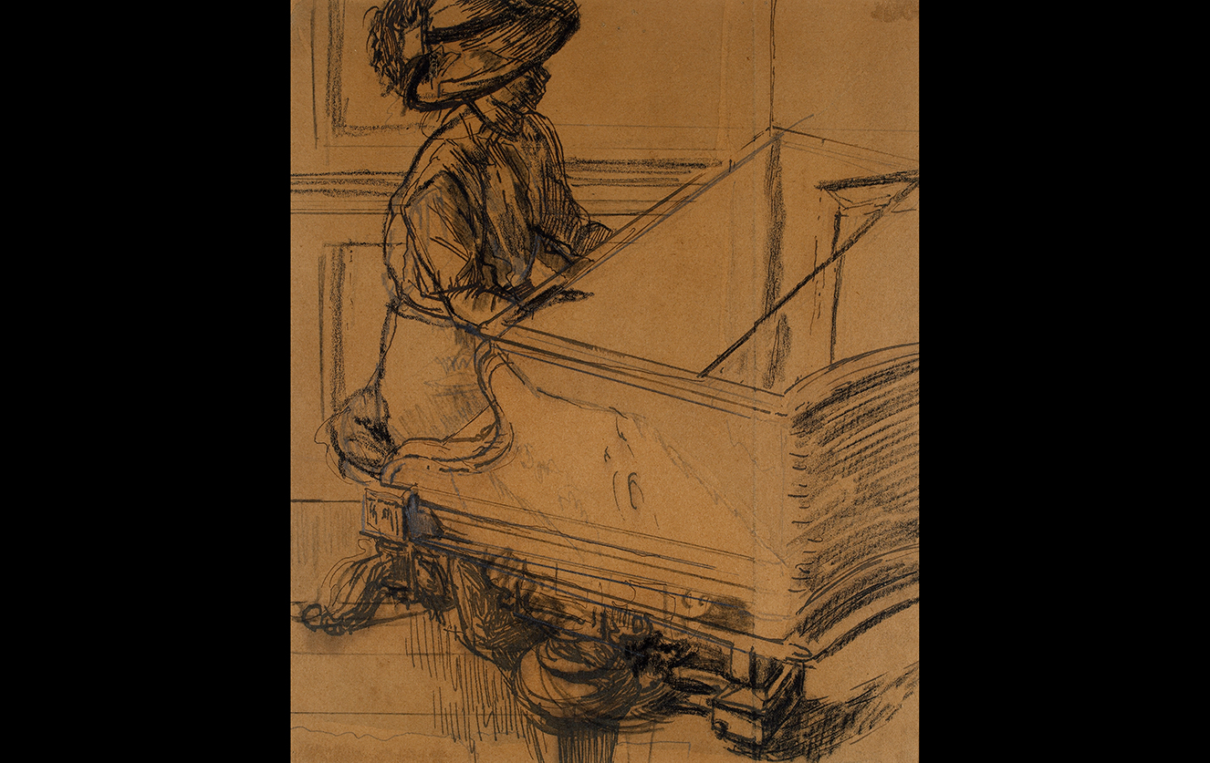 The Camden Town artist Walter Sickert (1860–1942) was born in Munich, the son of a Danish-German artist. At the outbreak of war he had to provide evidence to the Home Office that his father had been naturalized to avoid being interned. Too old to be called up, he was an influential teacher between 1915 and 1918 at the Westminster School of Art, where he taught the painter David Bomberg (1890–1957). This is a study for Sickert's painting Tipperary (1914) at Tate Britain in London, which shows a music-hall pianist playing the familiar wartime song 'It's a long way to Tipperary'. Written in 1912 by Jack Judge and Harry Williams, it is often thought of as the archetypal marching tune of World War I, but music was equally important for keeping up the spirits of those left behind at home.