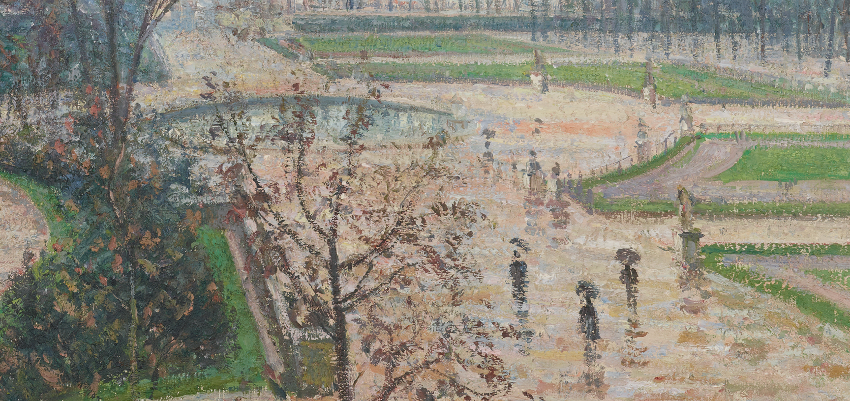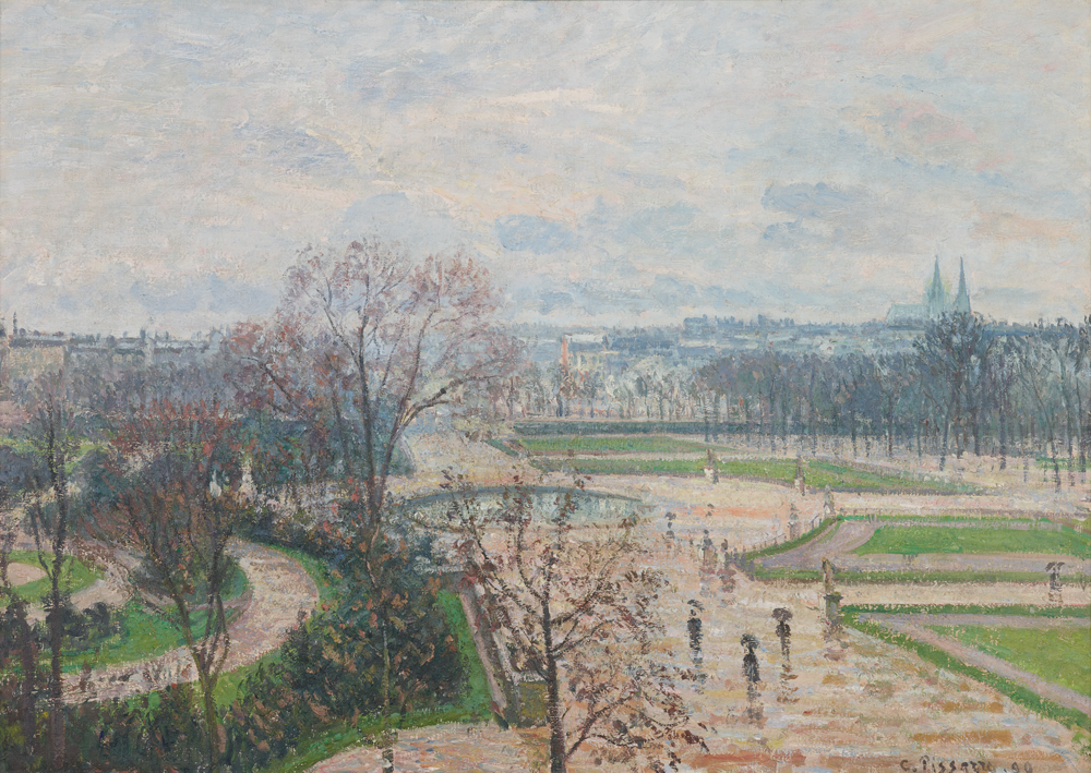 The view looks over the Tuileries towards the Seine, with the spires of the Church of Sainte-Clothilde on the right. The weather was wet and cold, but appropriate for the pearly light and subdued effects Pissarro wished to convey.